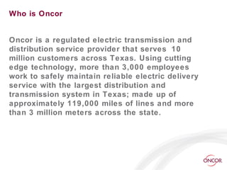 Oncor is a regulated electric transmission and distribution service provider that serves 10 million customers across Texas.